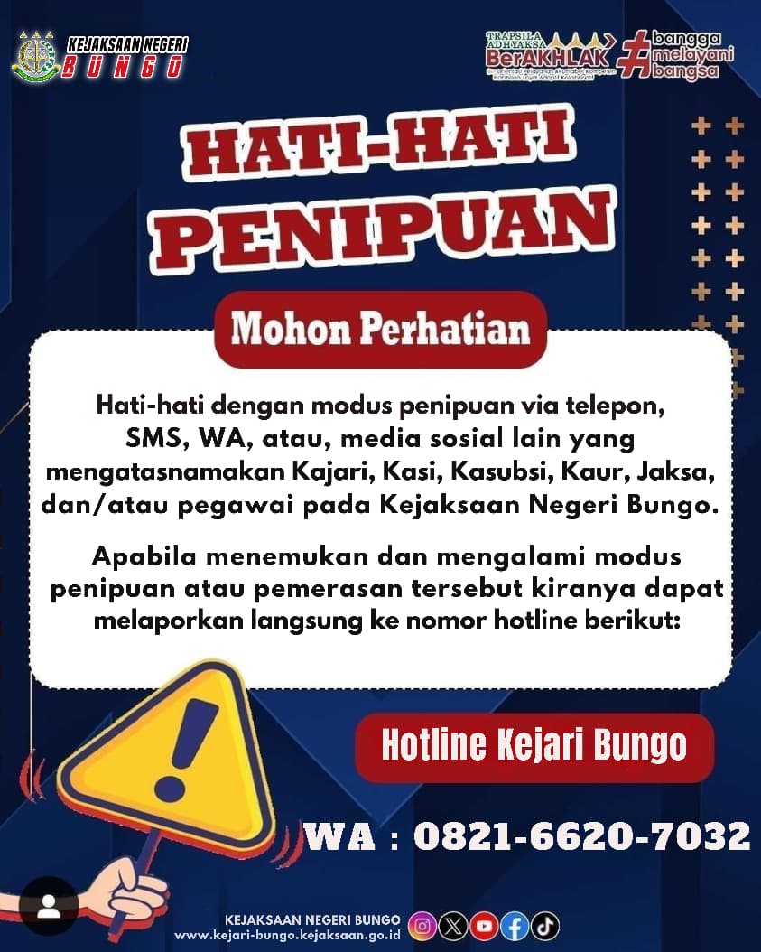 Akun Resmi Kejaksaan Negeri Bungo Jl. Prof. Dr. Sri Soedewi No. 29, Kel. Pasir Putih Kec. Rimbo Tengah Kab. Bungo Provinsi Jambi.