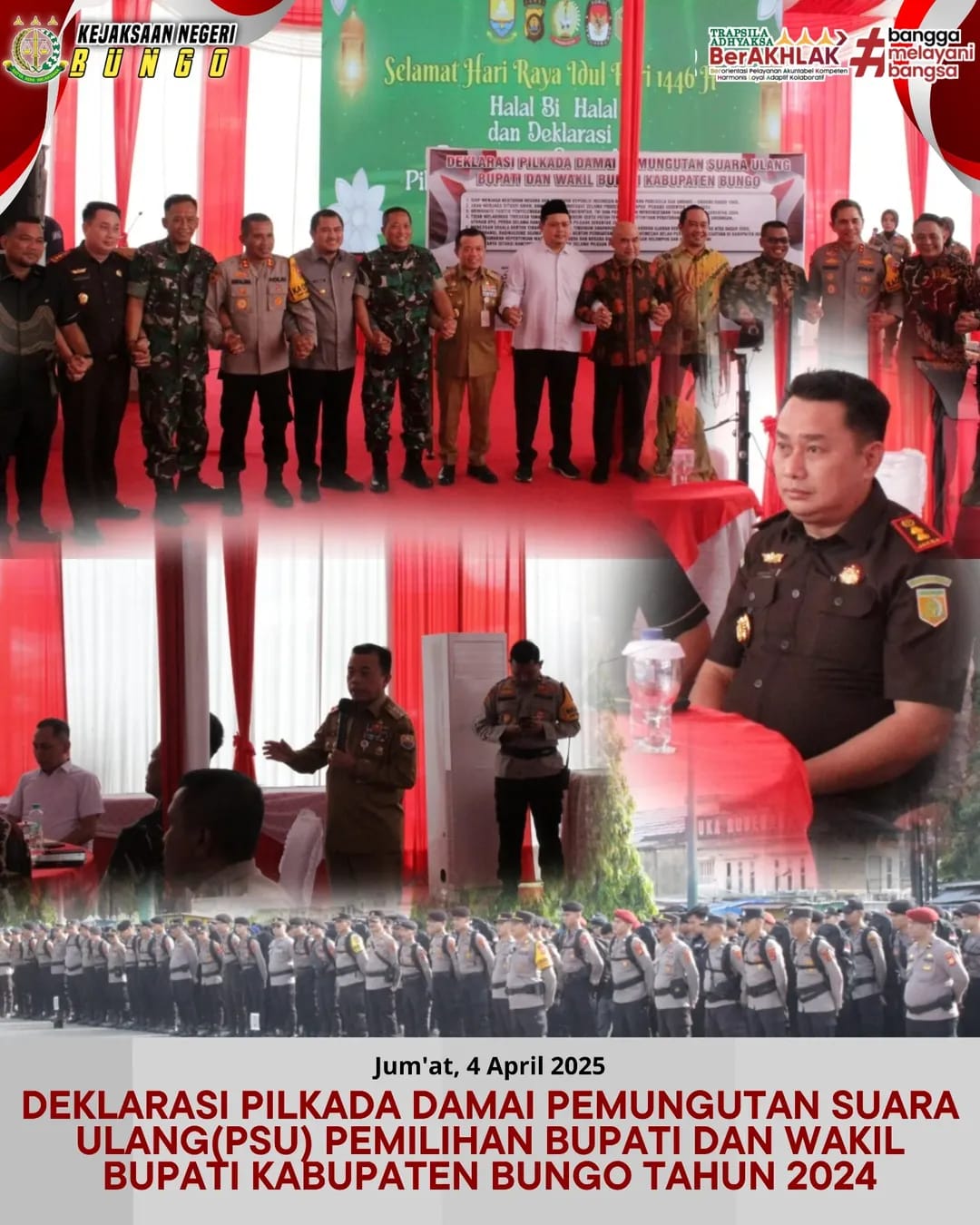 Bahwa pada hari Jumat tanggal 04 April 2025 Pukul 09.30 Wib bertempat di Lapangan Polres Bungo telah dilaksanakan Deklarasi Pilkada Damai Pemungutan Suara Ulang(PSU) Pemilihan Bupati dan Wakil Bupati Kabupaten Bungo Tahun 2024.