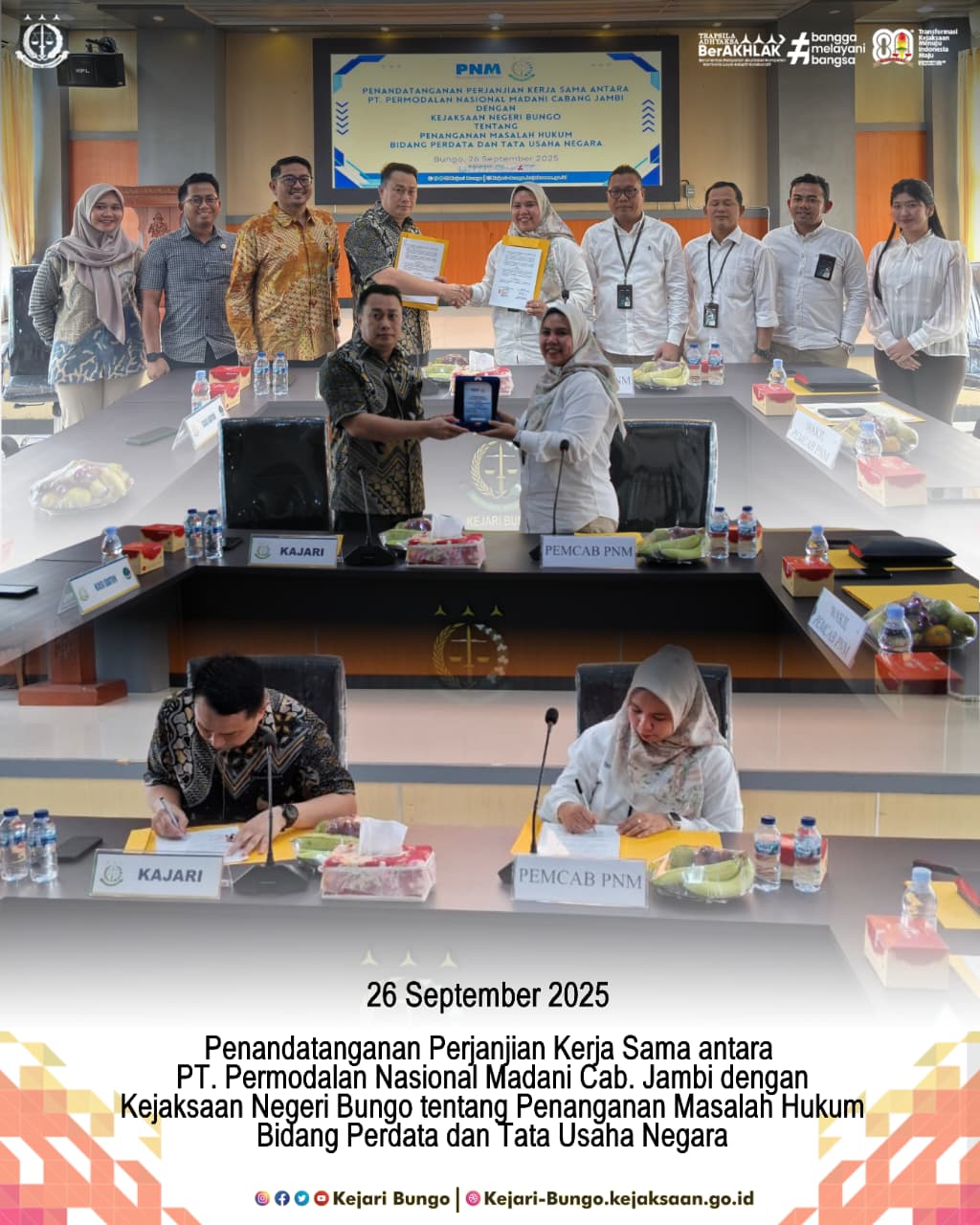Bahwa pada Hari Jum’at, 26 September 2025, bertempat di Aula Lt.3 Kejari Bungo, telah dilaksanakan Kegiatan Penandatanganan Perjanjian Kerja Sama (MoU) antara Kejaksaan Negeri Bungo dengan PT. Permodalan Nasional Madani (PNM) Cab. Jambi di Bidang Hukum Perdata dan Tata Usaha Negara,