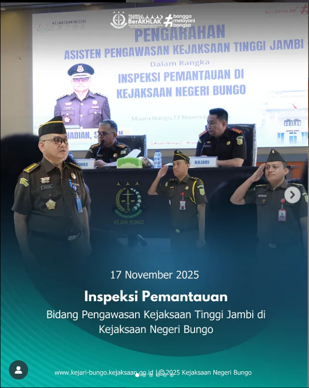 sekira pukul 08.00 WIB bertempat di Kantor Kejaksaan Negeri Bungo telah berlangsung Kegiatan Pelaksanaan Pemantauan Kejaksaan Tinggi Jambi Tahun 2025 di Kejaksaan Negeri Bungo oleh Asisten Pengawasan Kejaksaan Tinggi Jambi.