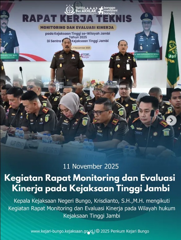 Selasa, 11 November 2025, Kepala Kejaksaan Negeri Bungo, Krisdianto, S.H.,M.H. mengikuti Kegiatan Rapat Monitoring & Evaluasi Kinerja pada Wilayah Hukum Kejaksaan Tinggi Jambi